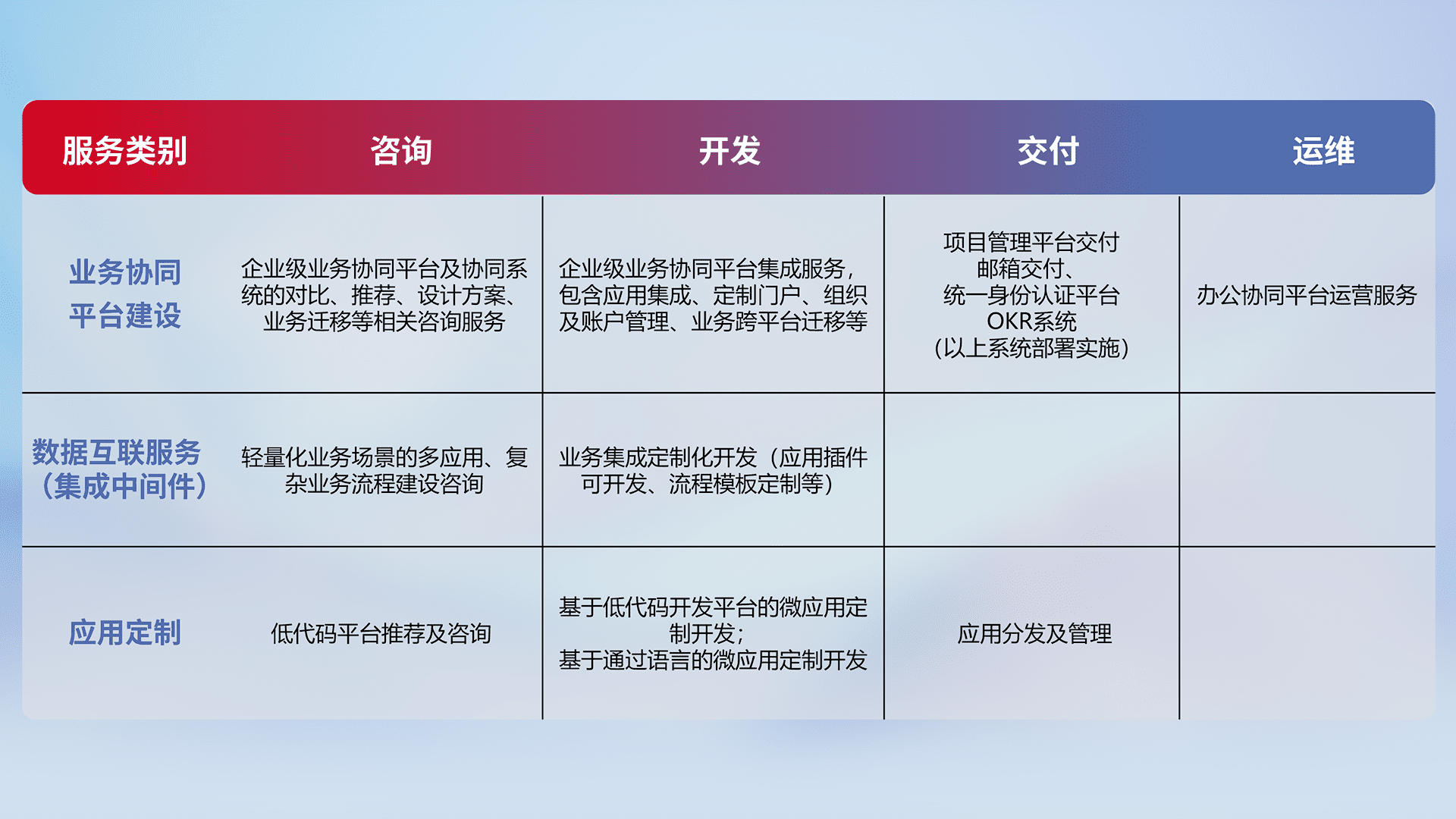 针对钉钉、、企微、、、IDaas等平台级产品提供产品的规划、、方案、、交付、、定制化开发等服务,,,,实现如统一协同办公、、智能客户服务、、混合会议管理、、、智能数据查询、、等业务场景,,,,实现数字化转型。。。。